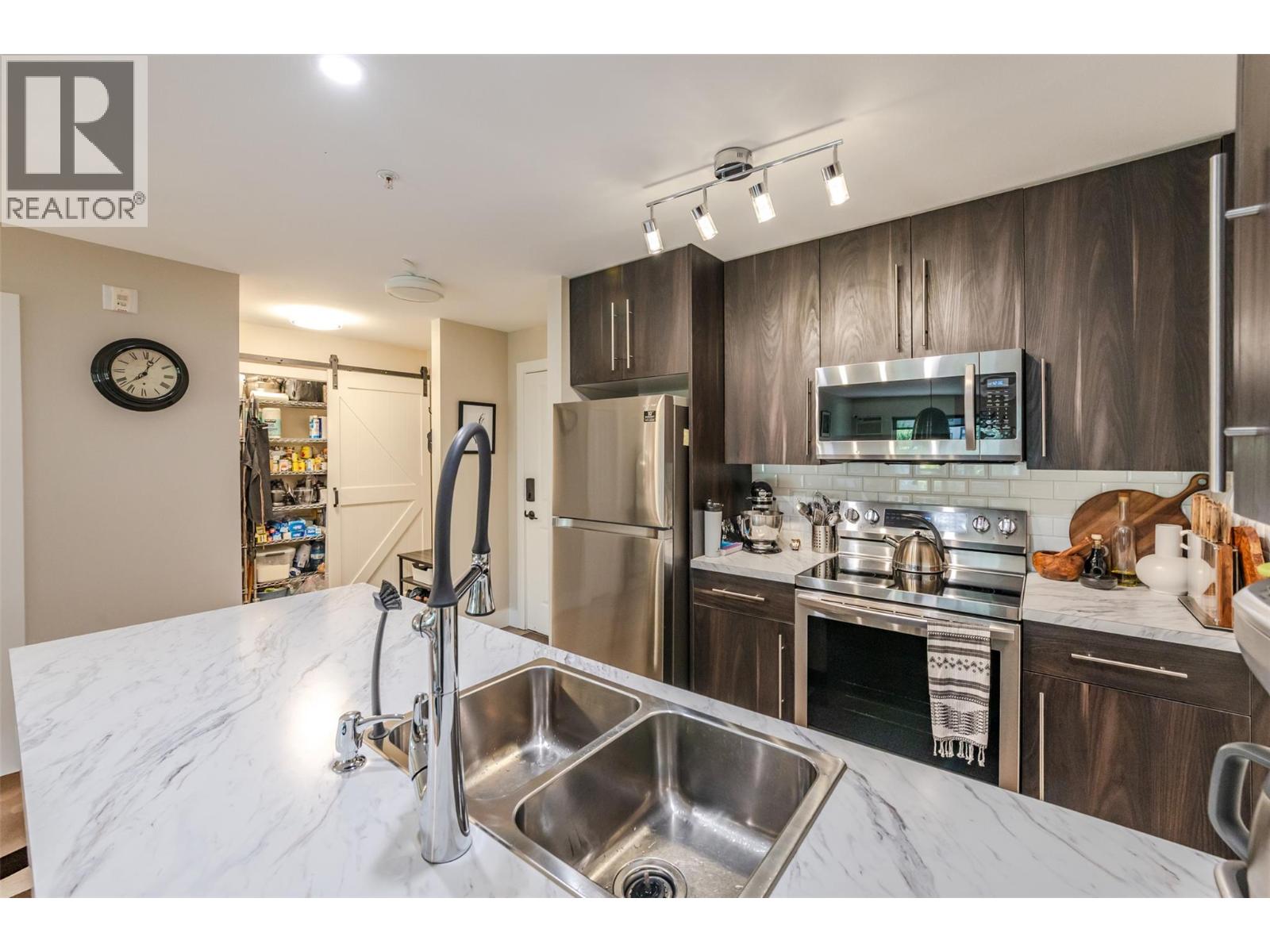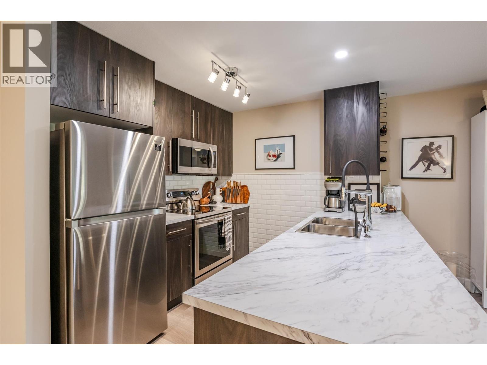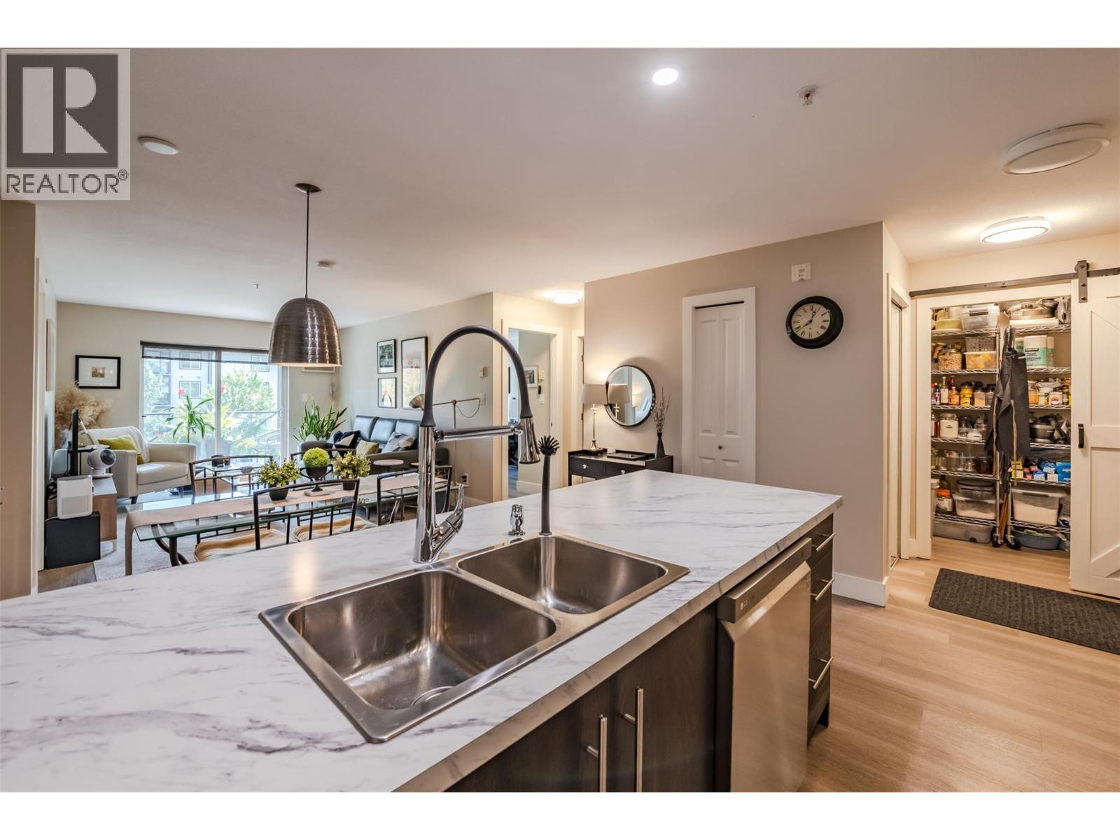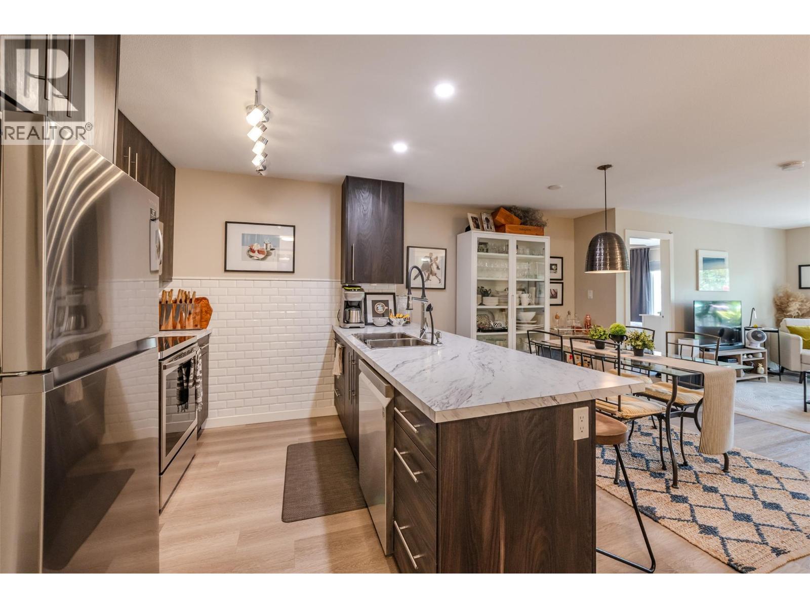 Beautiful and updated 2 Bedroom/2 Bath Condo in the heart of Penticton at The Ellis complex on Hastings Ave. Some of the improvements of this tastefully renovated condo are upgraded kitchen cabinets and countertops with an extended 9ft. peninsula Island that makes entertaining a breeze with a 10” overhang for up to 4 bar stools. There is an extensive use of white beveled subway tiles for a designer touch. The attractive open concept kitchen comes with quality stainless appliances including a stove with convection oven, dual zone fridge, high end DW and microwave with LED lighting throughout. The open concept dining area has room for a table and 6 chairs and a display cabinet. Quality vinyl plank flooring throughout and a custom Benjamin Moore paint color gives this unit a high-end look with a neutral palette for all your decorating choices. The Master Bedroom has a barn door that leads to an upgraded walk-through closet and ensuite with extensive upgrades such as the cabinet/countertop/backsplash. The front entrance has a sizeable closet with a 4’ x 8’ storage/pantry behind a 2nd barn door. This property boasts a beautiful, covered deck with upgraded vinyl flooring facing east to enjoy the morning sunrise and provides shade in the hot afternoon summers. Close to shopping, entertainment, restaurants, and only a few minute's drive to the beach. There is a secure heated parkade with one assigned stall and a 2nd underground stall included and prepaid for a year if closing is completed by Oct. 31st 2025. Strata fees are a low $382 per month and includes hot water. Pets allowed (2 cats). The Ellis at Kettle Valley has no age restrictions with rentals opportunities for the investor. (id:4069)
